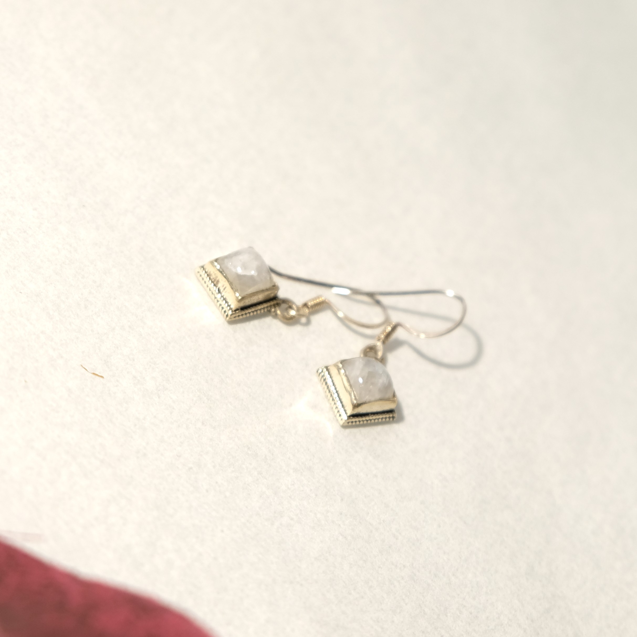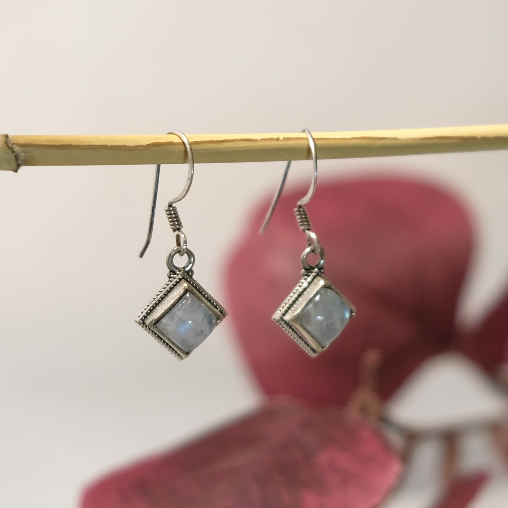 Ασημένια αντικέ σκουλαρίκια με φεγγαρόπετρα σε σχήμα τετράγωνο.