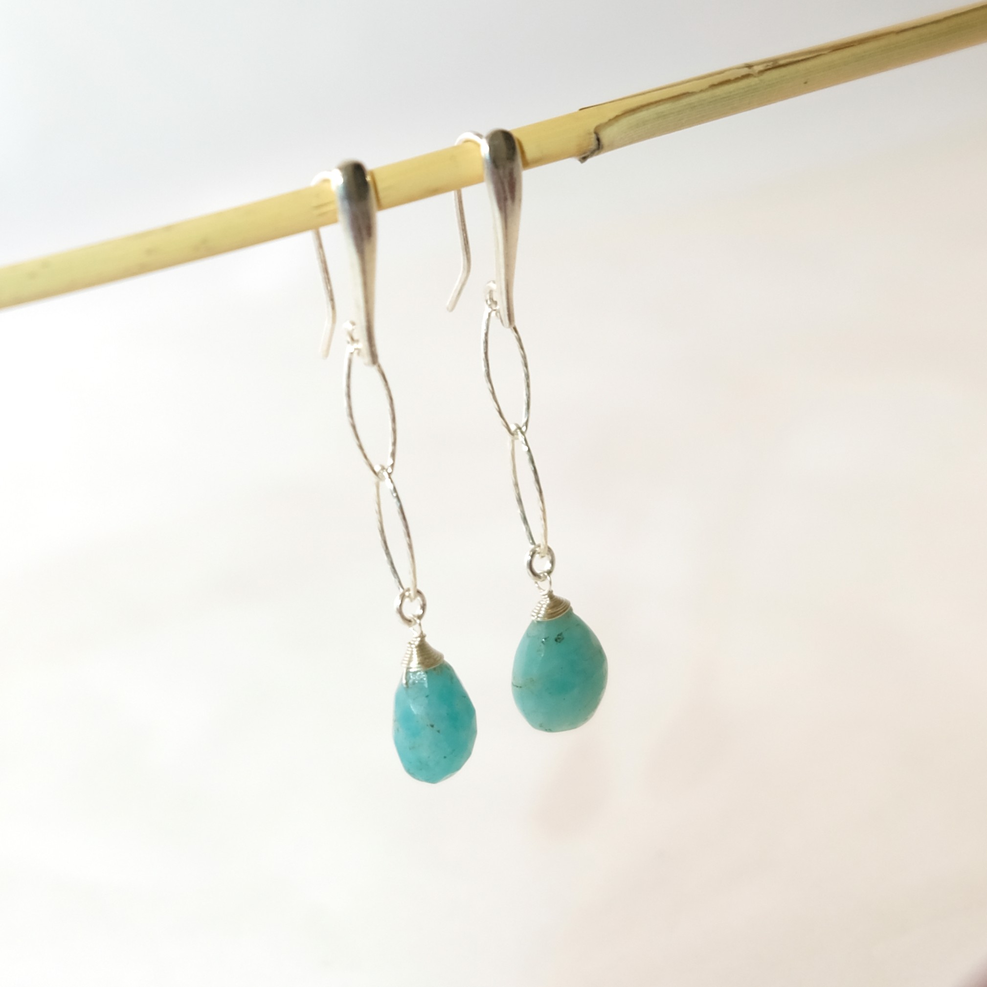 Ασημένια σκουλαρίκια με Αμαζονίτη σε σχήμα δάκρυ. Μήκος σκουλαρικιών 6 εκατοστά.