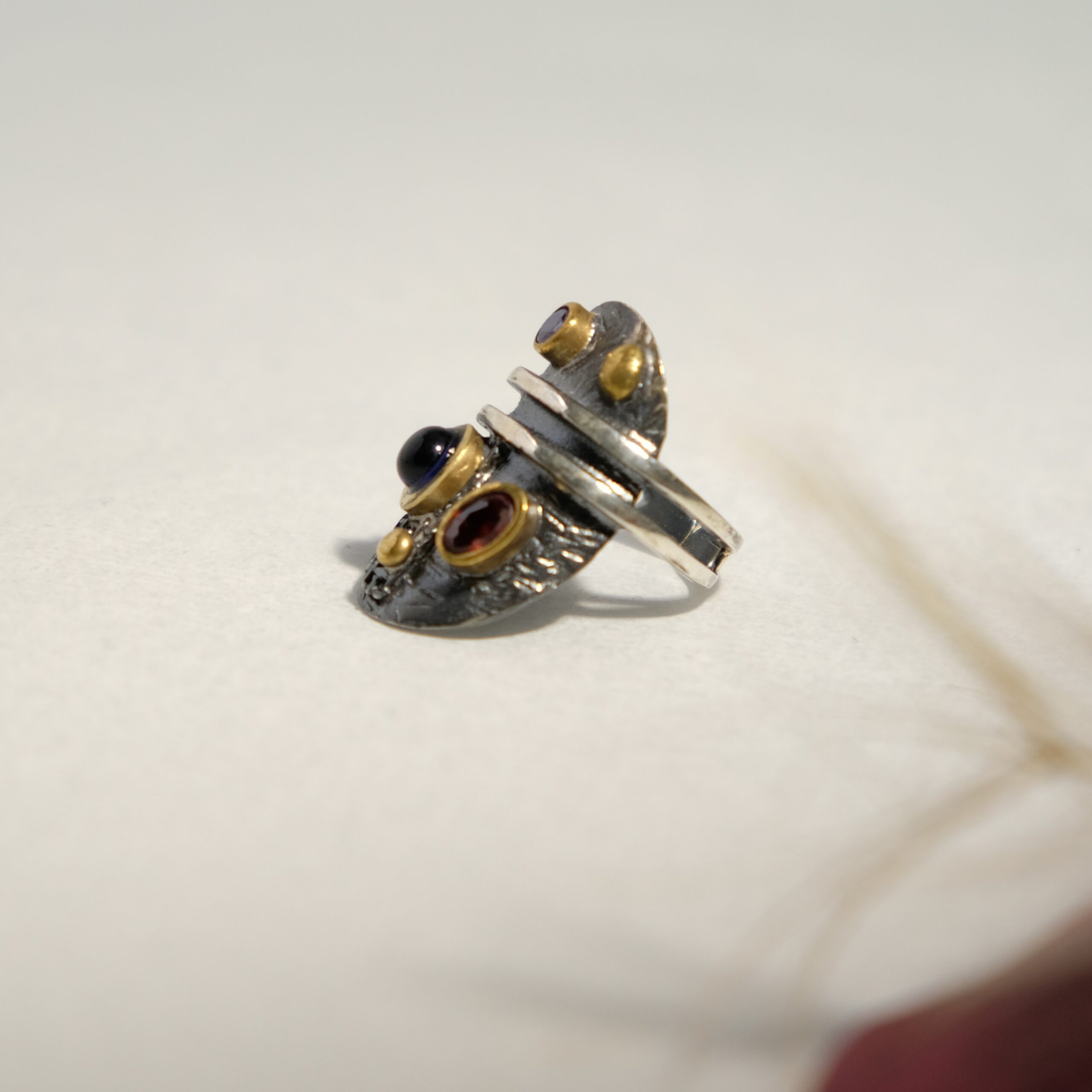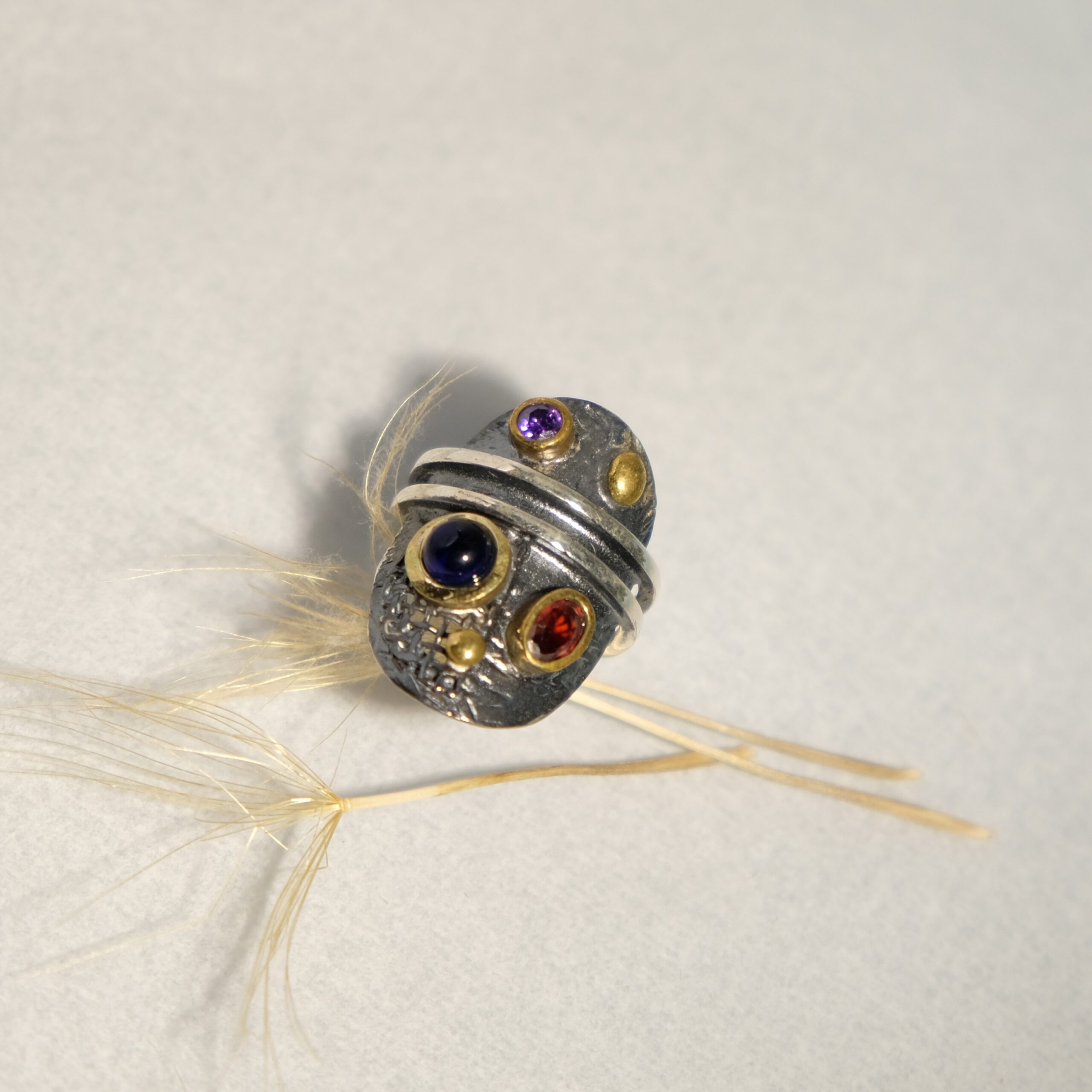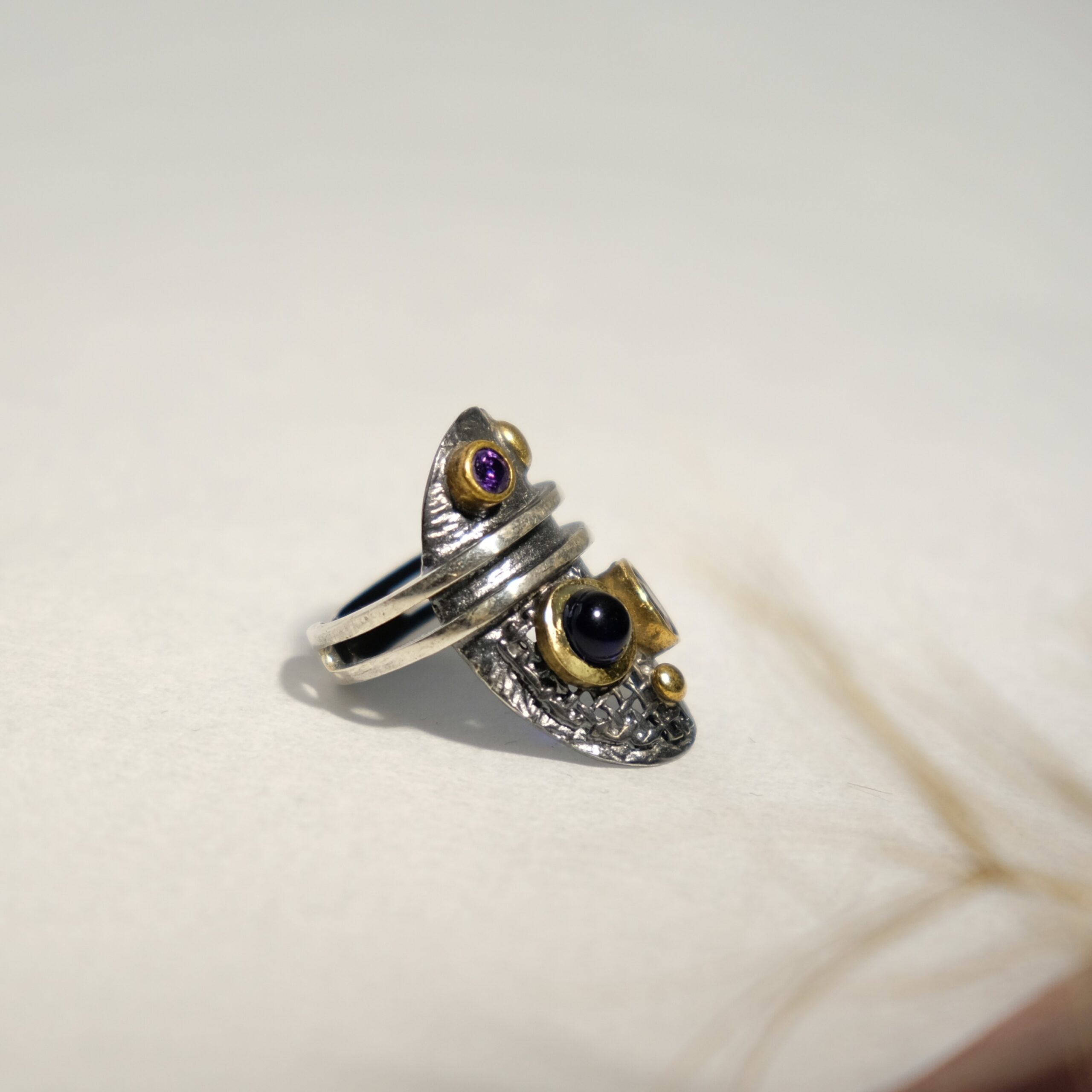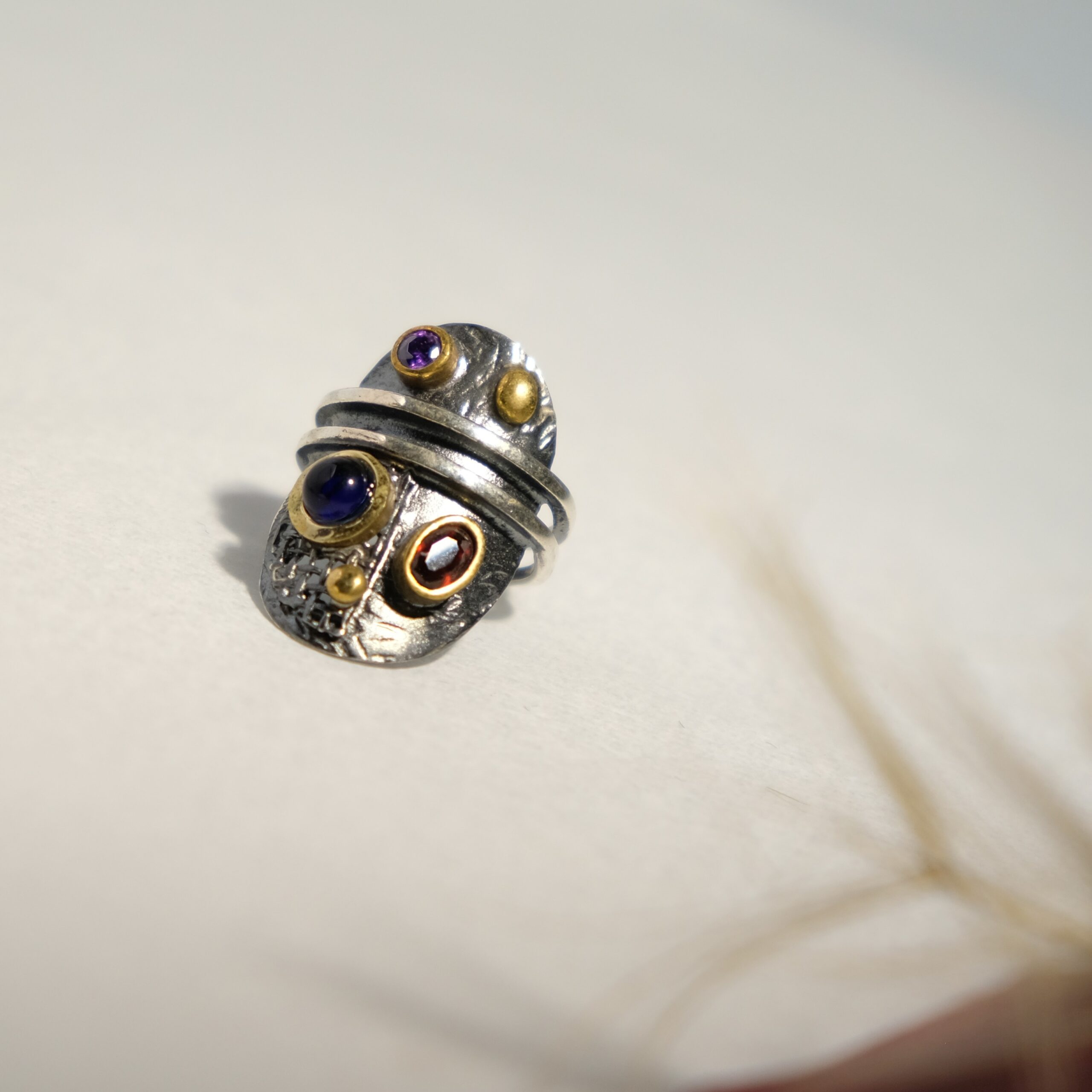 Ασημένιο αντικέ δαχτυλίδι με Αμέθυστο και γρανάτη. Ιδιαίτερο και μοναδικό κόσμημα ..όπως εσύ!