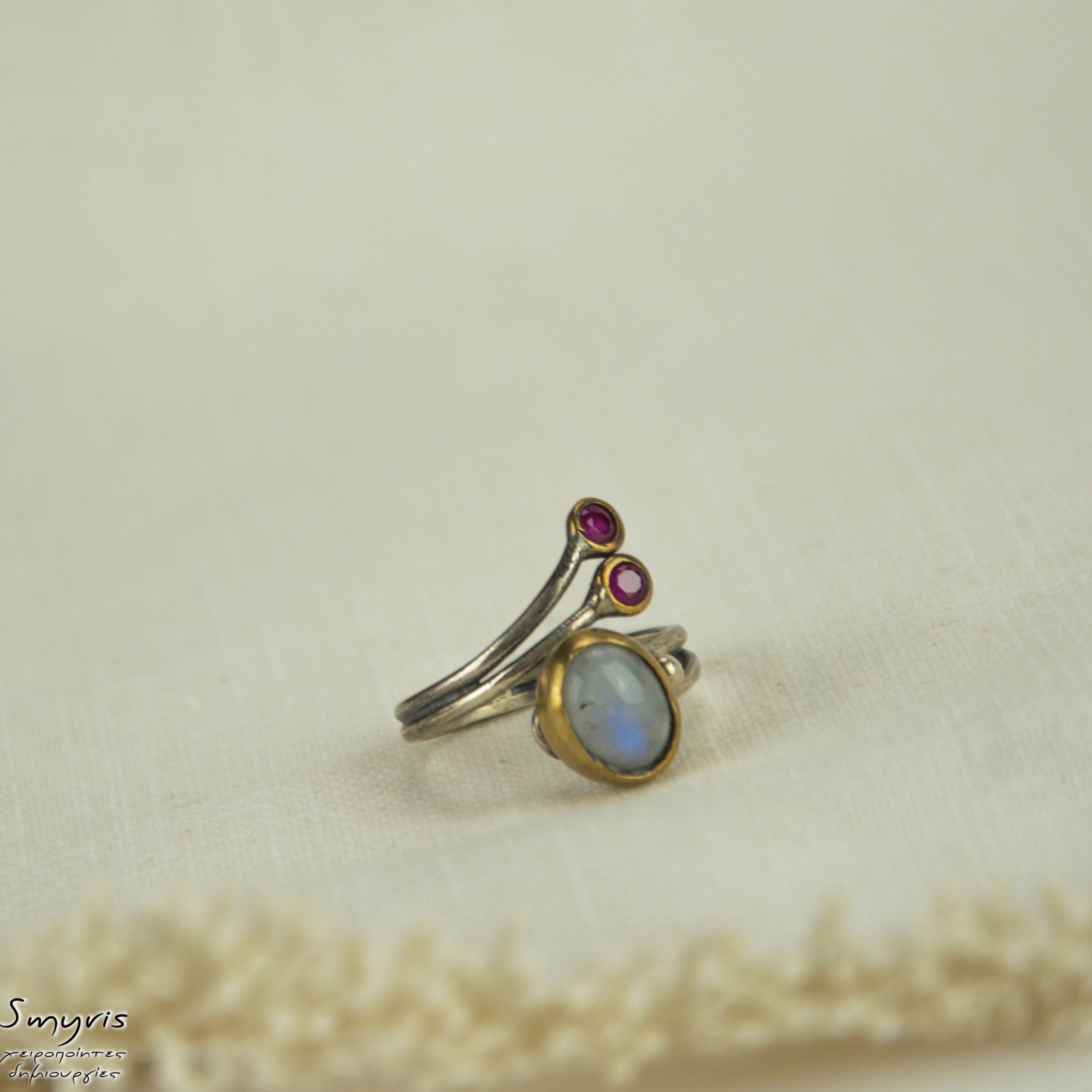 ◾ Ασημένιο 925 δαχτυλίδι ανοικτό, με φεγγαρόπετρα σε ασημένιο επιχρυσωμένο καστόνι και ρουμπινίτι.