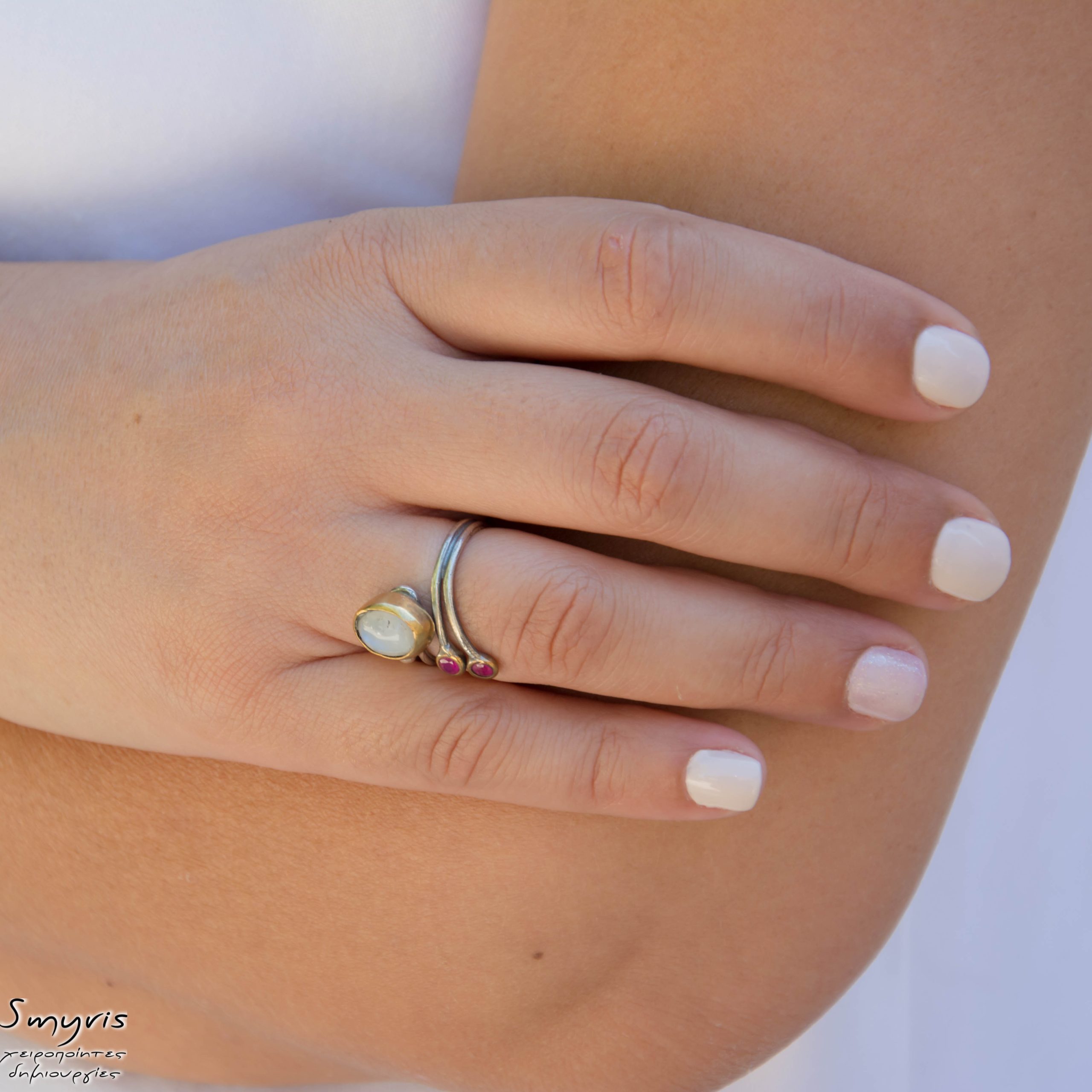 Ένα ασημένιο δαχτυλίδι ανοικτό με φεγγαρόπετρα και ρουμπινίτη. Που τις δύσκολες σου ώρες θα σου θυμίζει, ότι όσο δύσκολα κι αν είναι τα πράγματα την συγκεκριμένη στιγμή, όλα θα γίνουν καλύτερα.