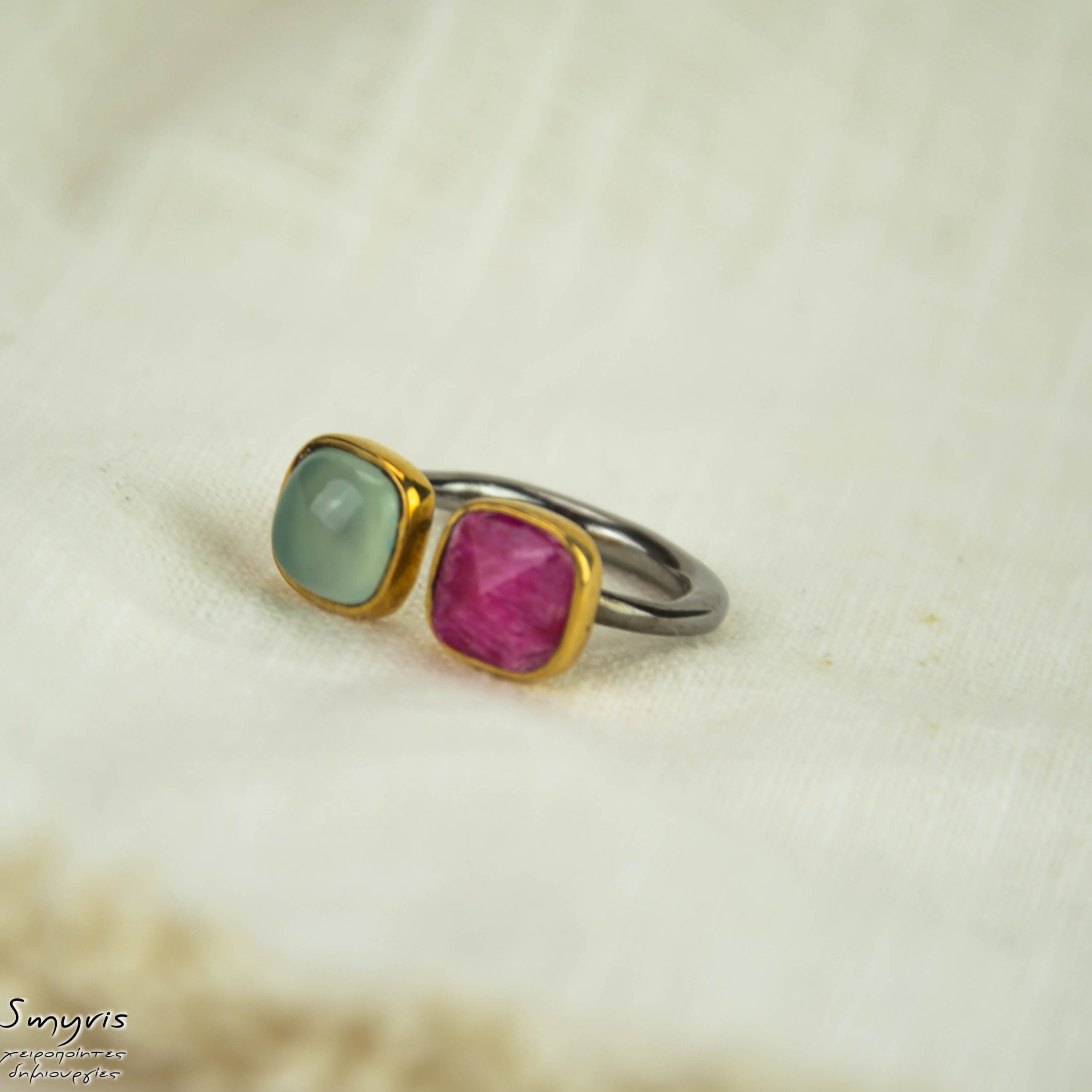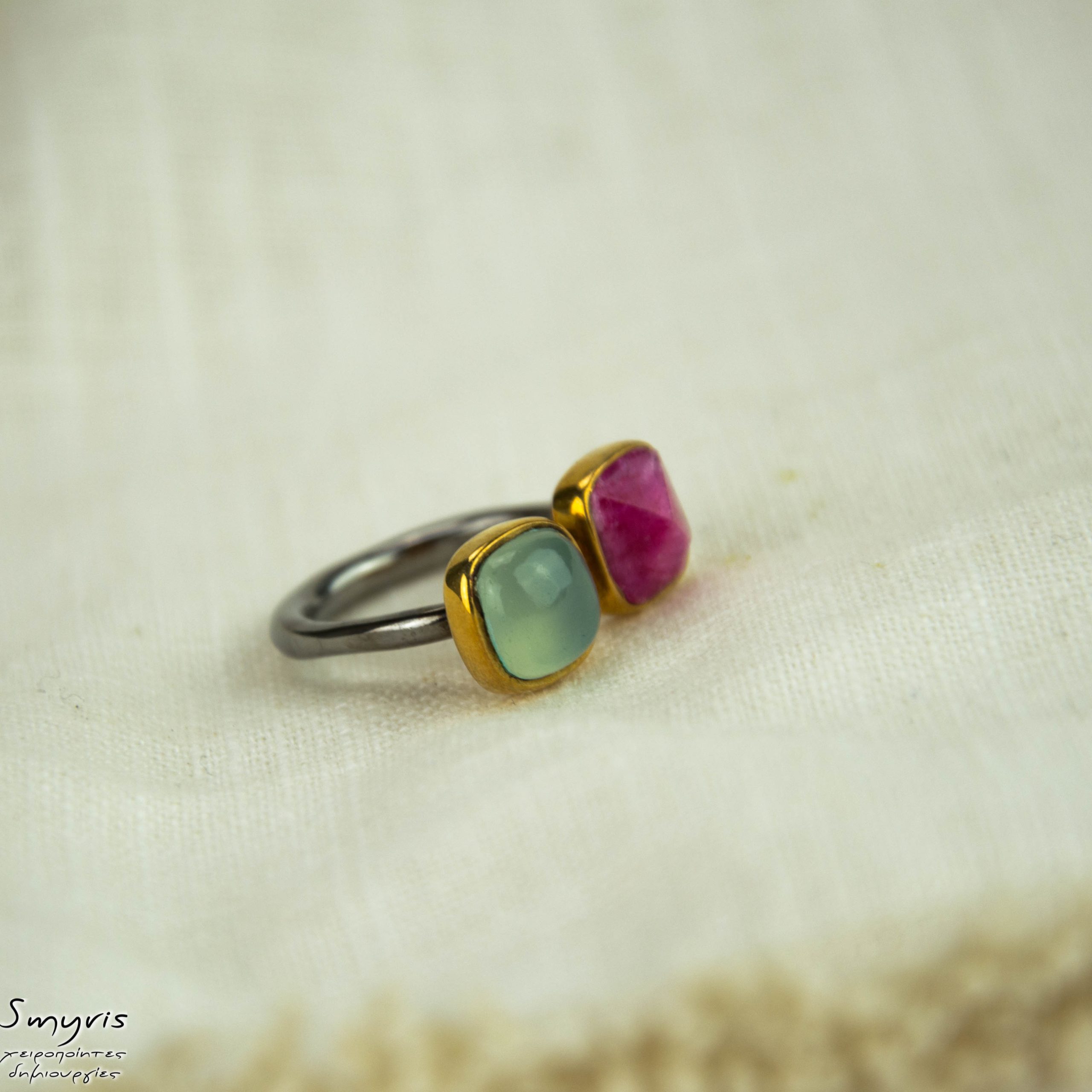 ◾ Ασημένιο 925 δαχτυλίδι με επιμετάλλωση ρουθηνίου με ρουμπινίτη και χαλκηδόνιο σε ασημένιο επιχρυσωμένο καστόνι. Διατίθεται σε Νο 54