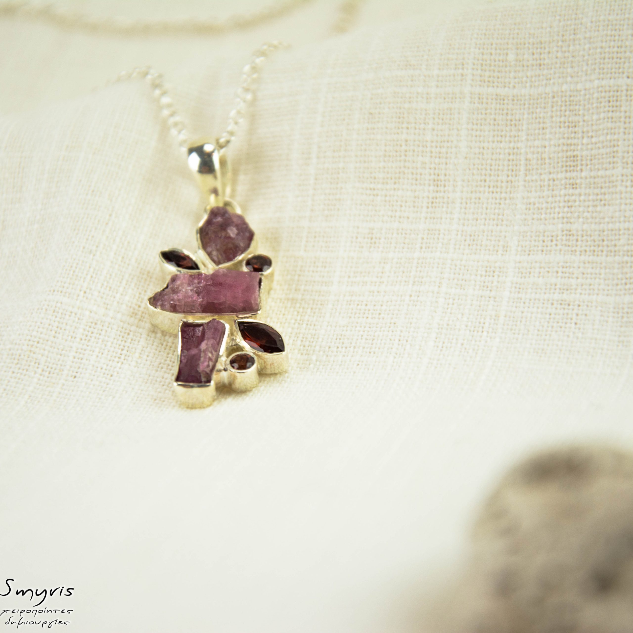 Ασημένιο μενταγιόν με ακατέργαστη ροζ τουρμαλίνη και γρανάτη