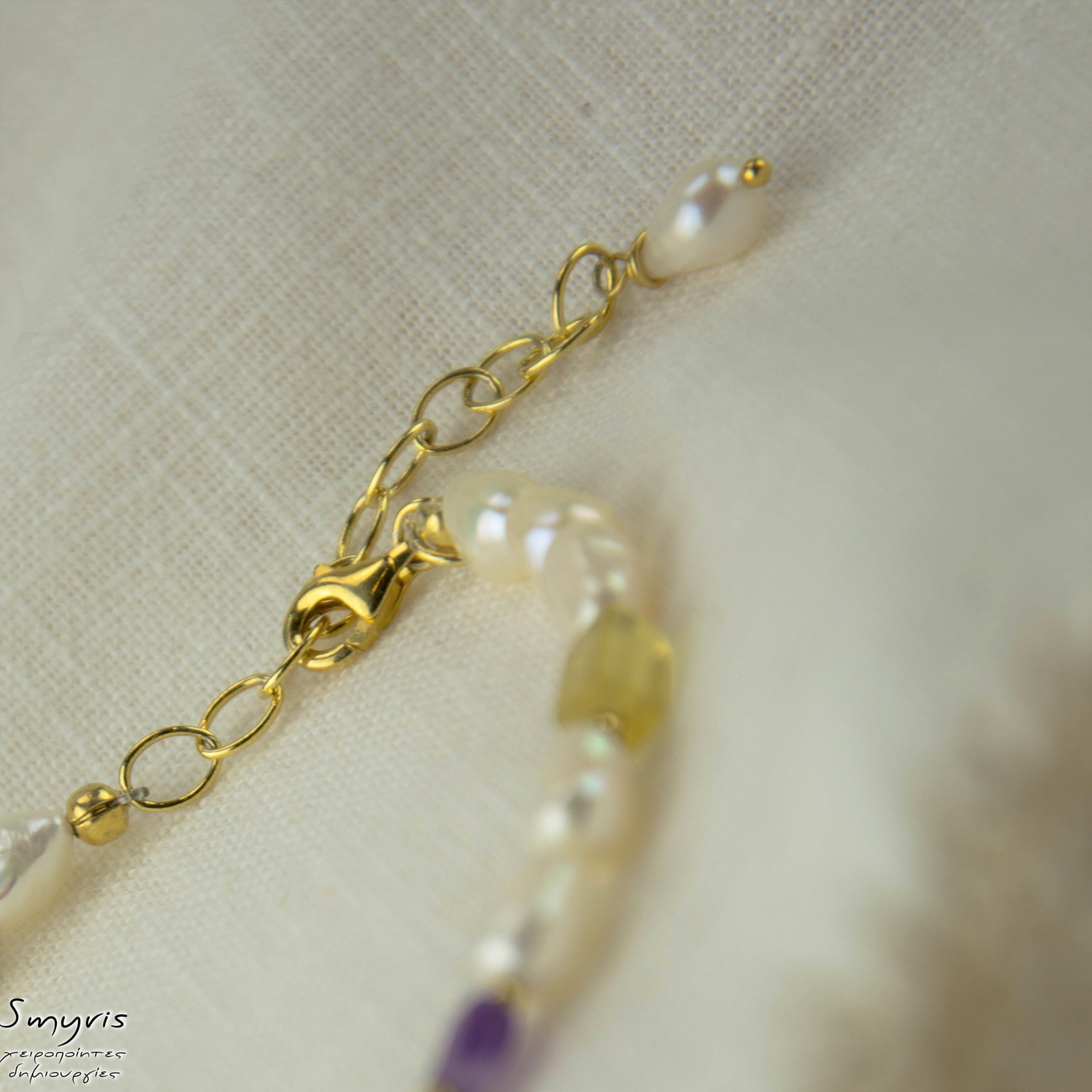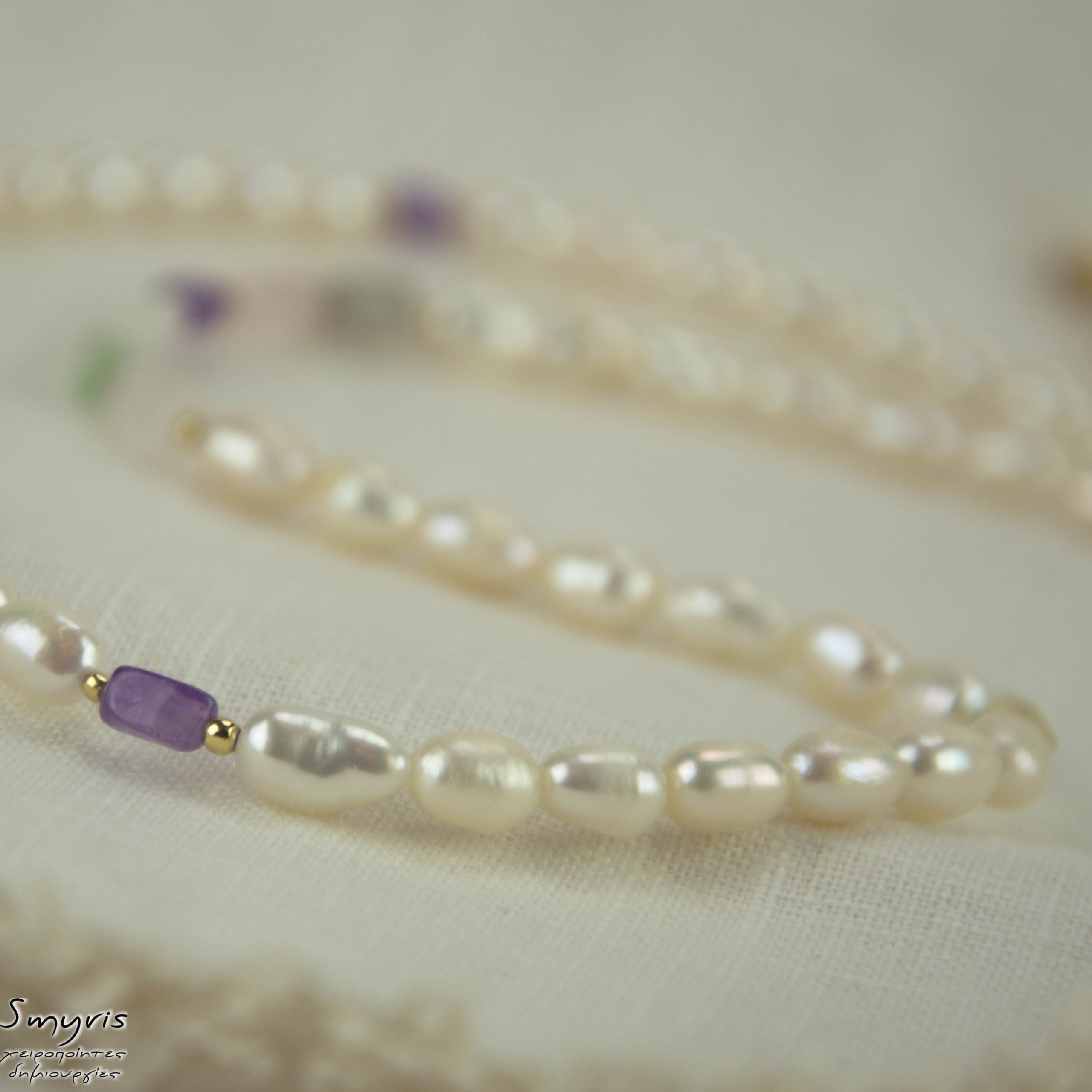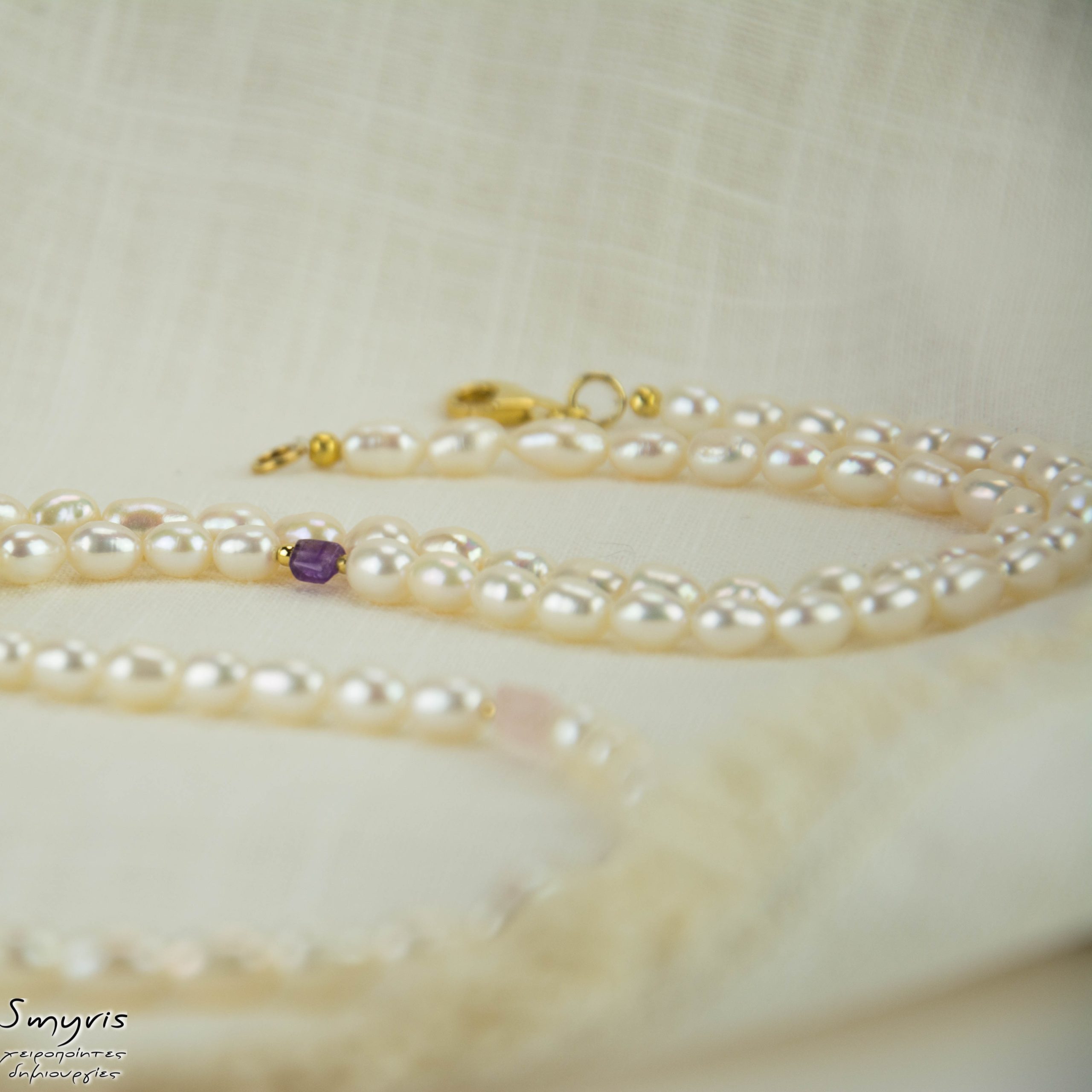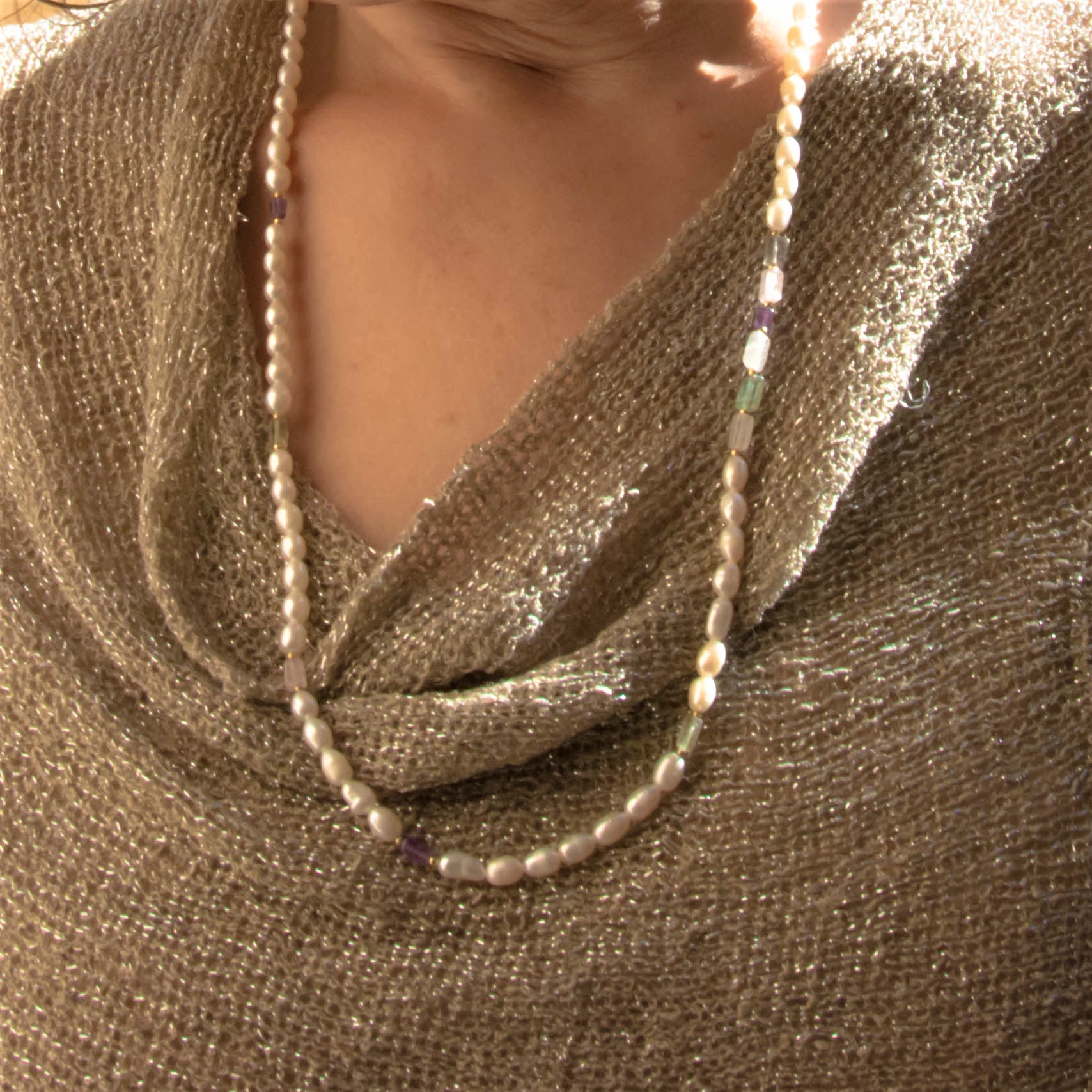 Κολιέ με μαργαριτάρια και Φθορίτη, ροζ χαλαζία, αμέθυστο και φεγγαρόπετρα. Με ασημένια 925 επιχρυσωμένα εξαρτήματα. Μήκος 70 εκ.