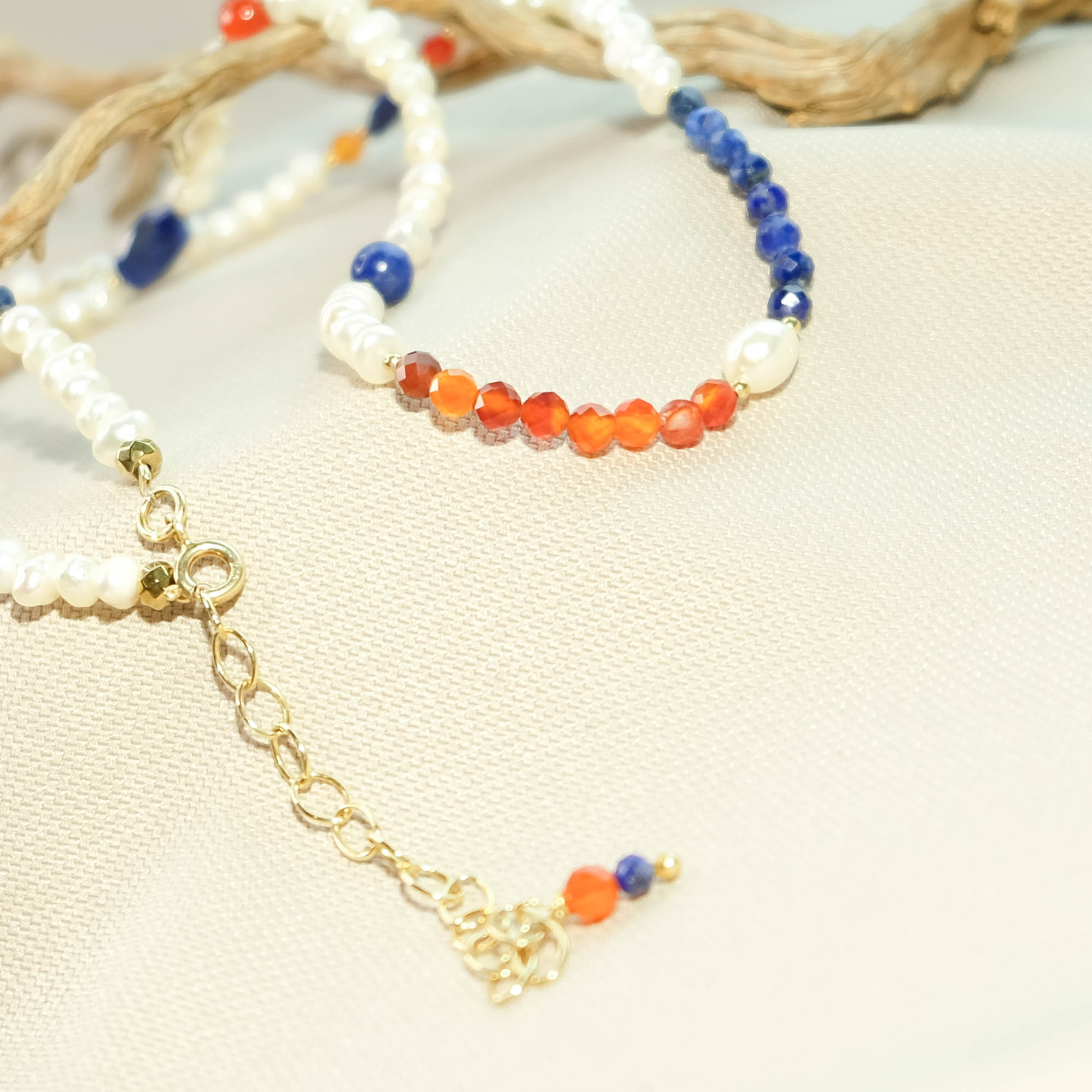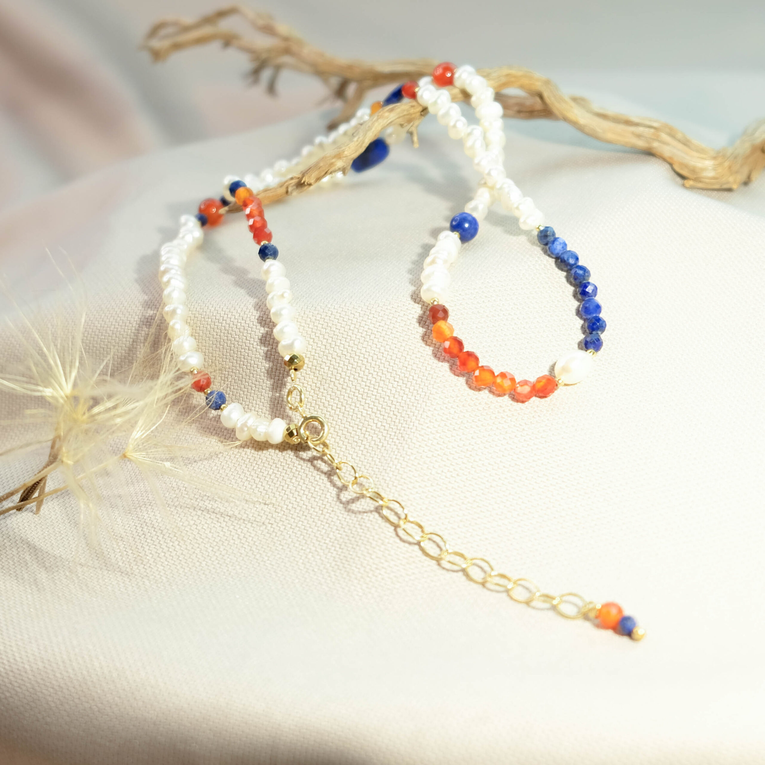 ▪️ Κολιέ με μαργαριτάρια, κορνεόλη και λάπι λάζουλι. Μήκος κολιέ 52εκ συν 5εκ αλυσίδα επέκτασης