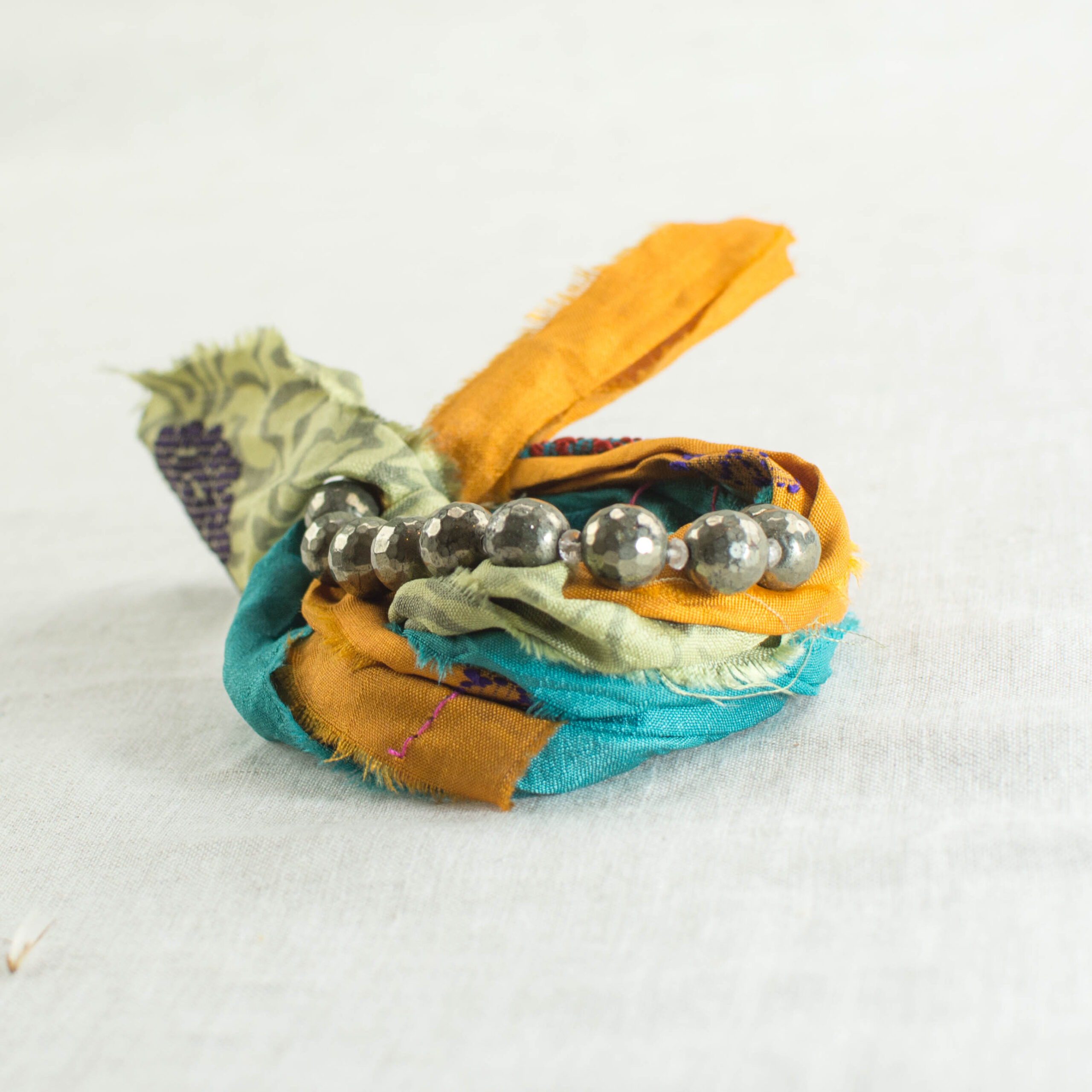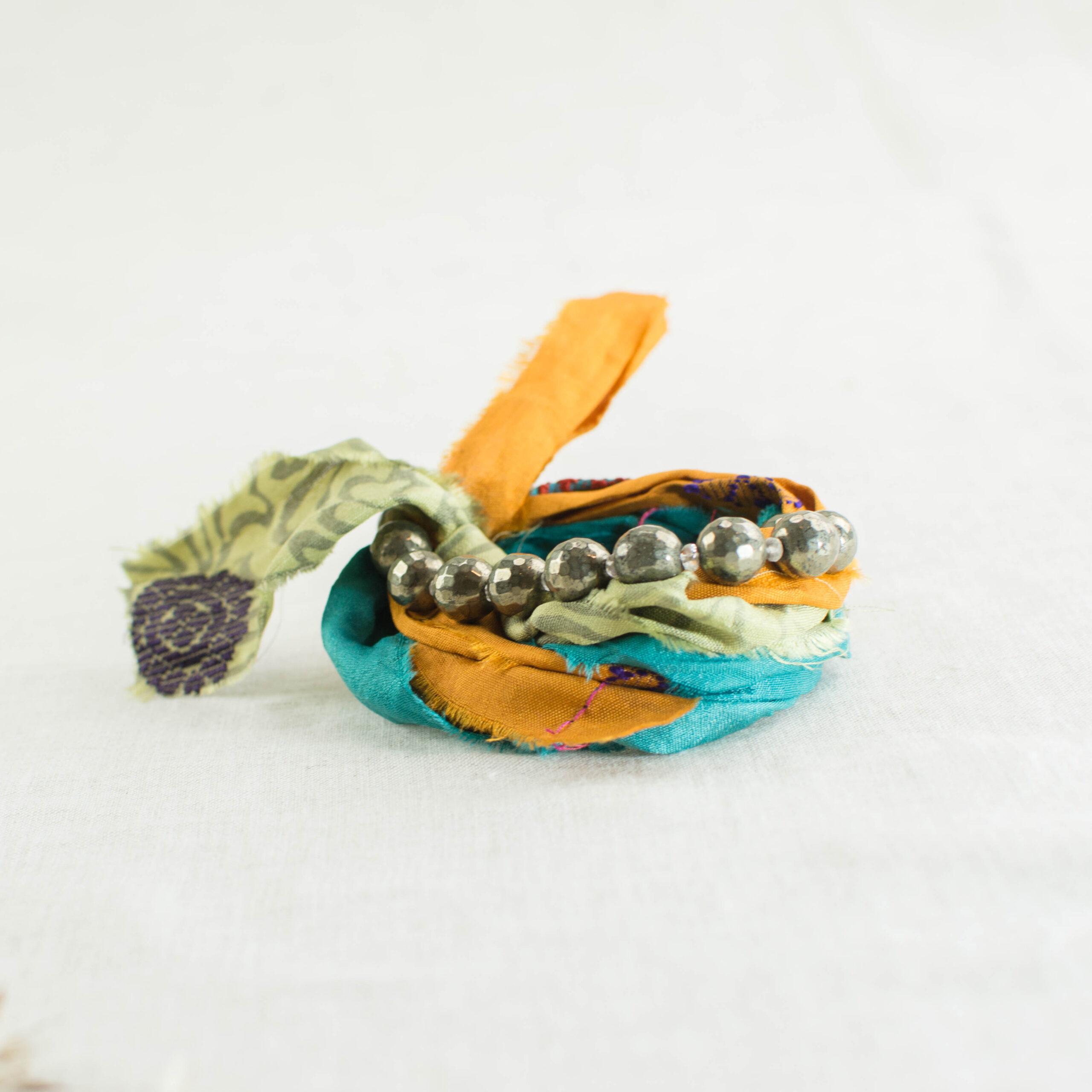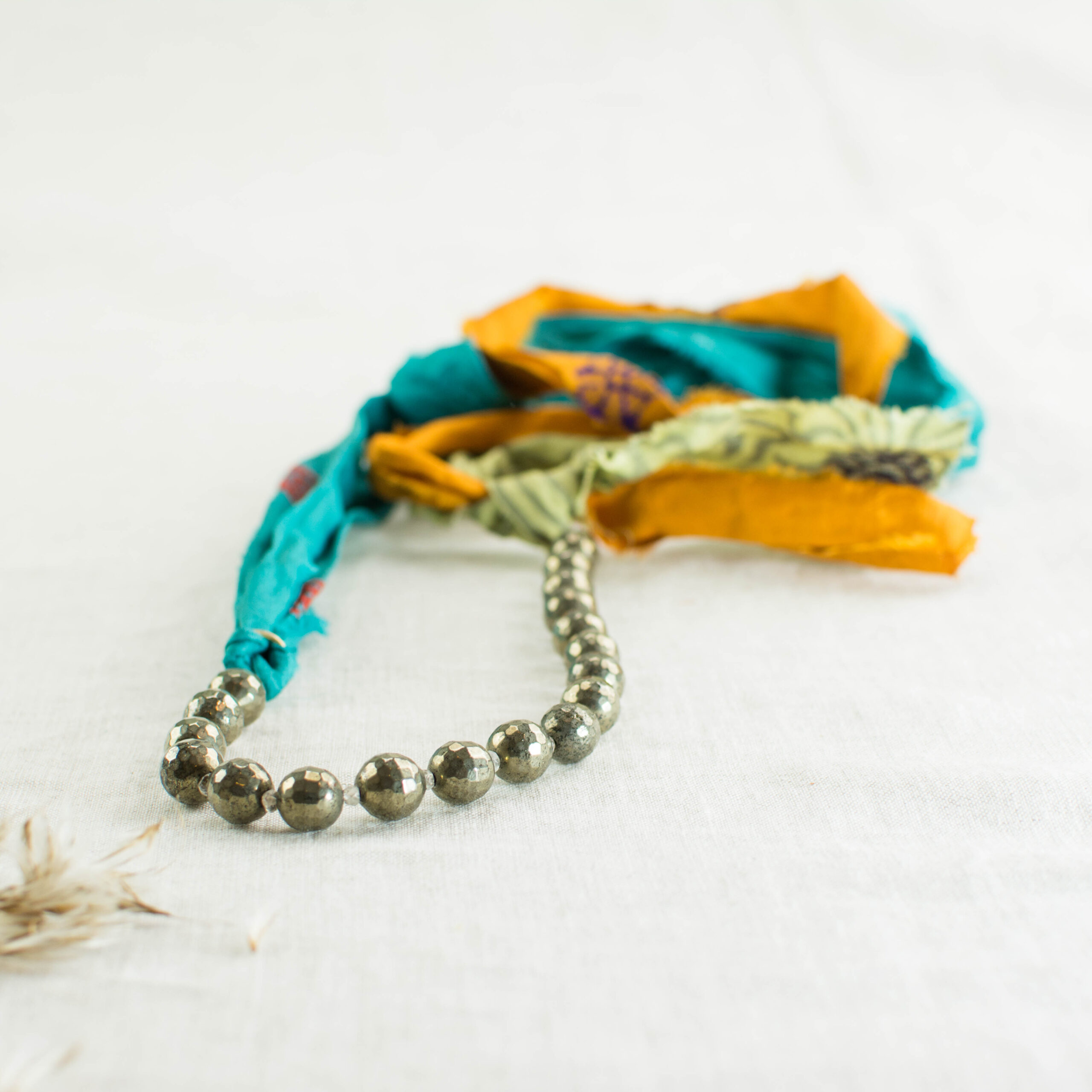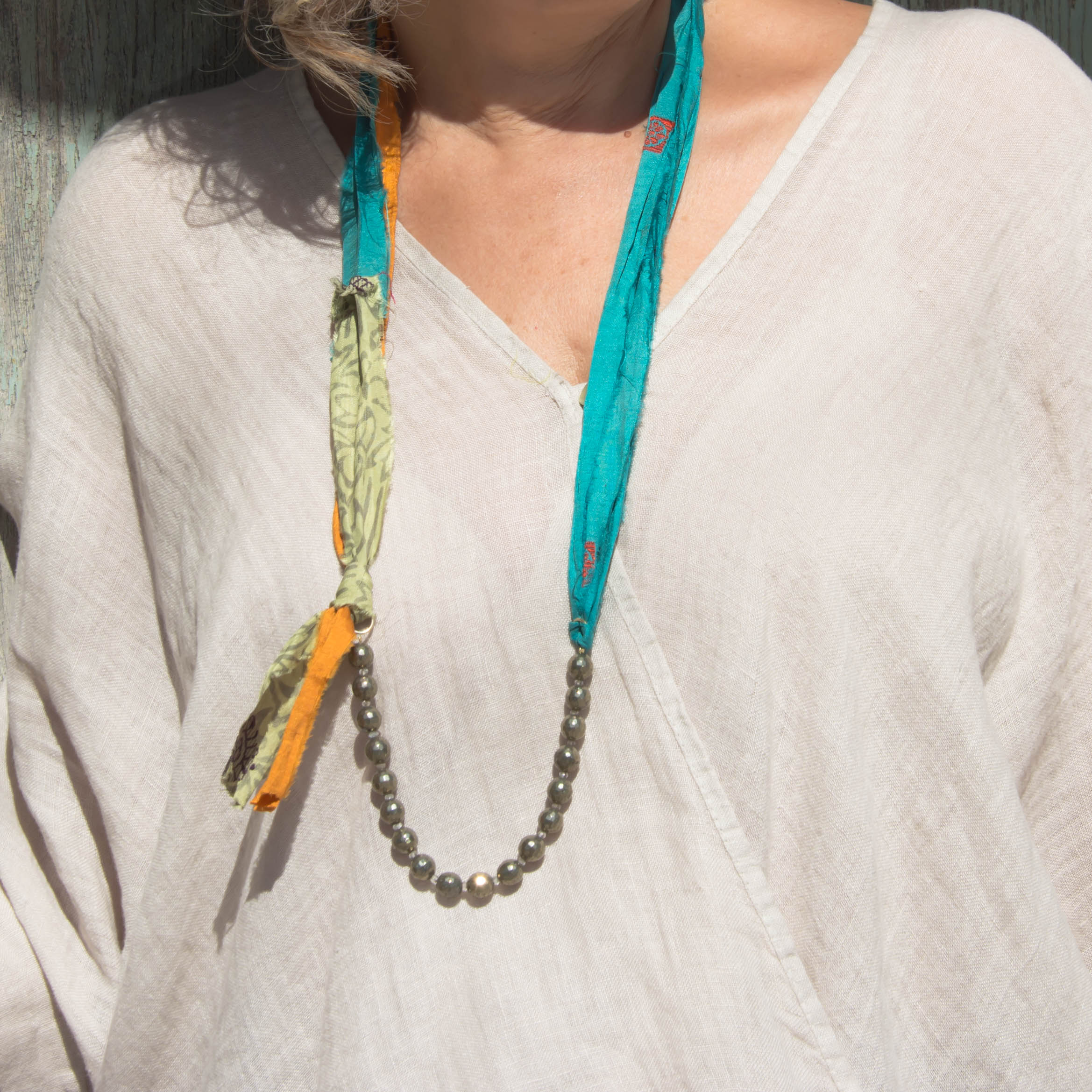 Κολιέ με σιδηροπυρίτη και μεταξωτές κορδέλες.
