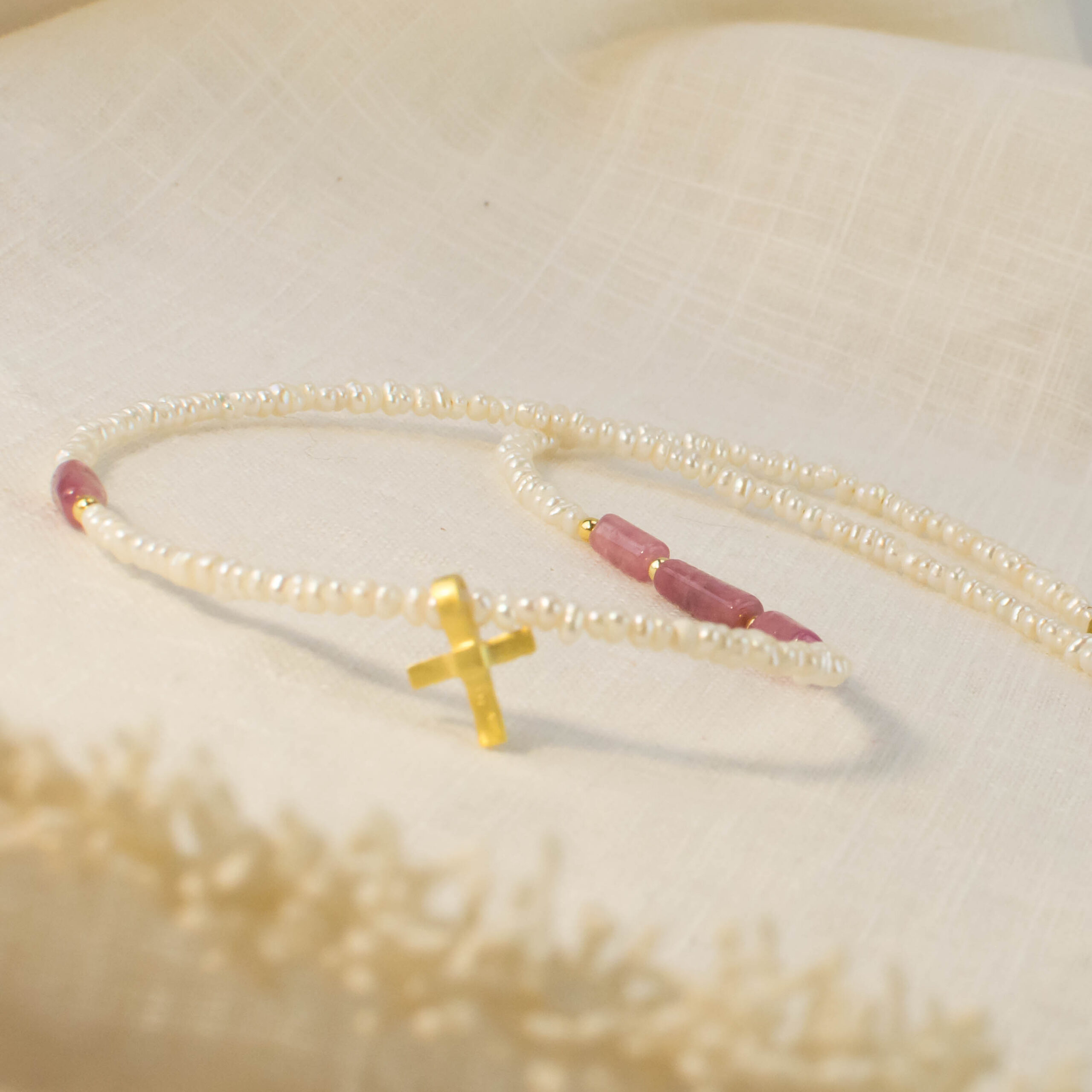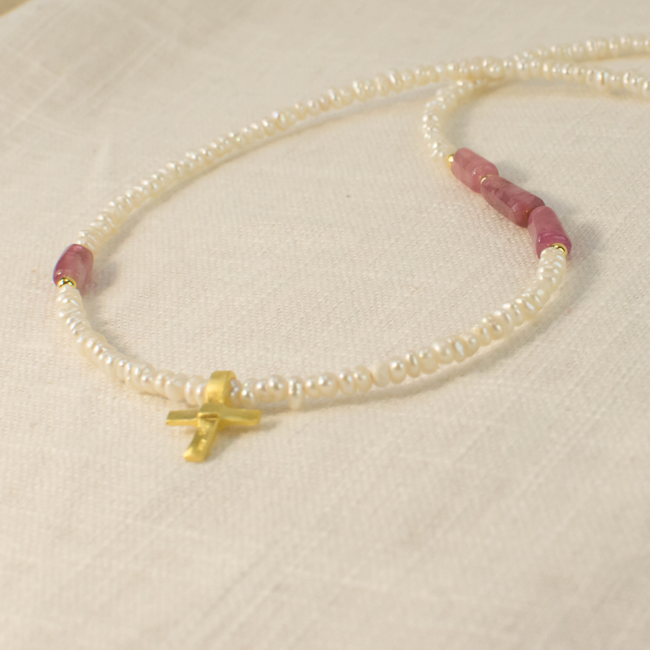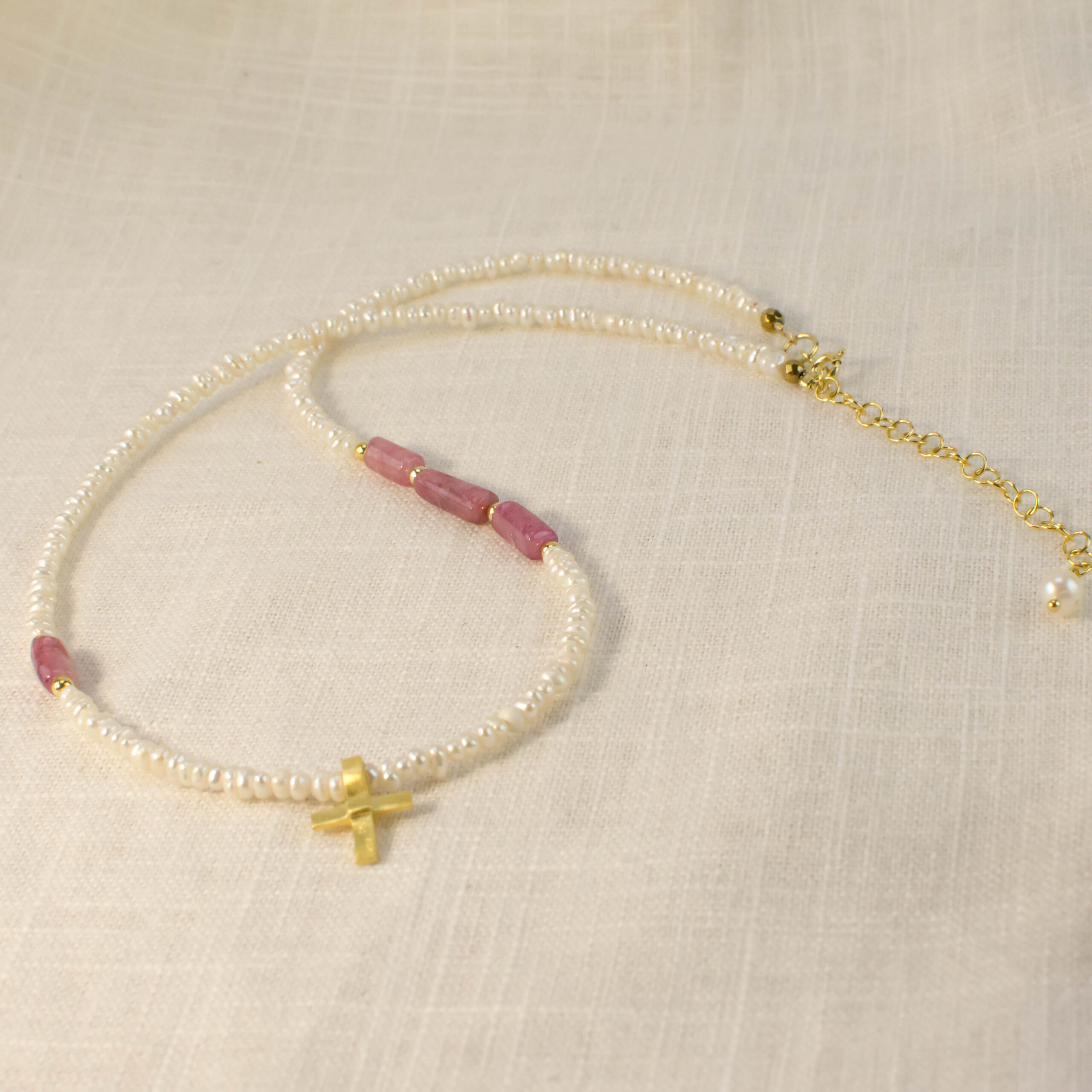 ▪️ Μαργαριταρένιο κολιέ με ροζ τουρμαλίνη και σταυρό ασημένιο 925 επιχρυσωμένο. Μήκος 41εκ. συν 5εκ. αλυσίδας επέκτασης.