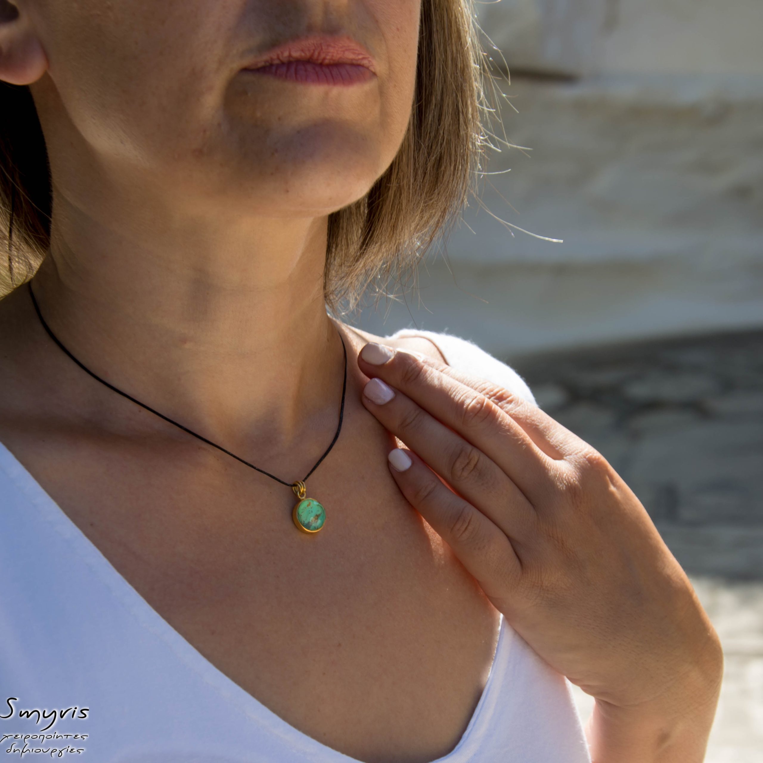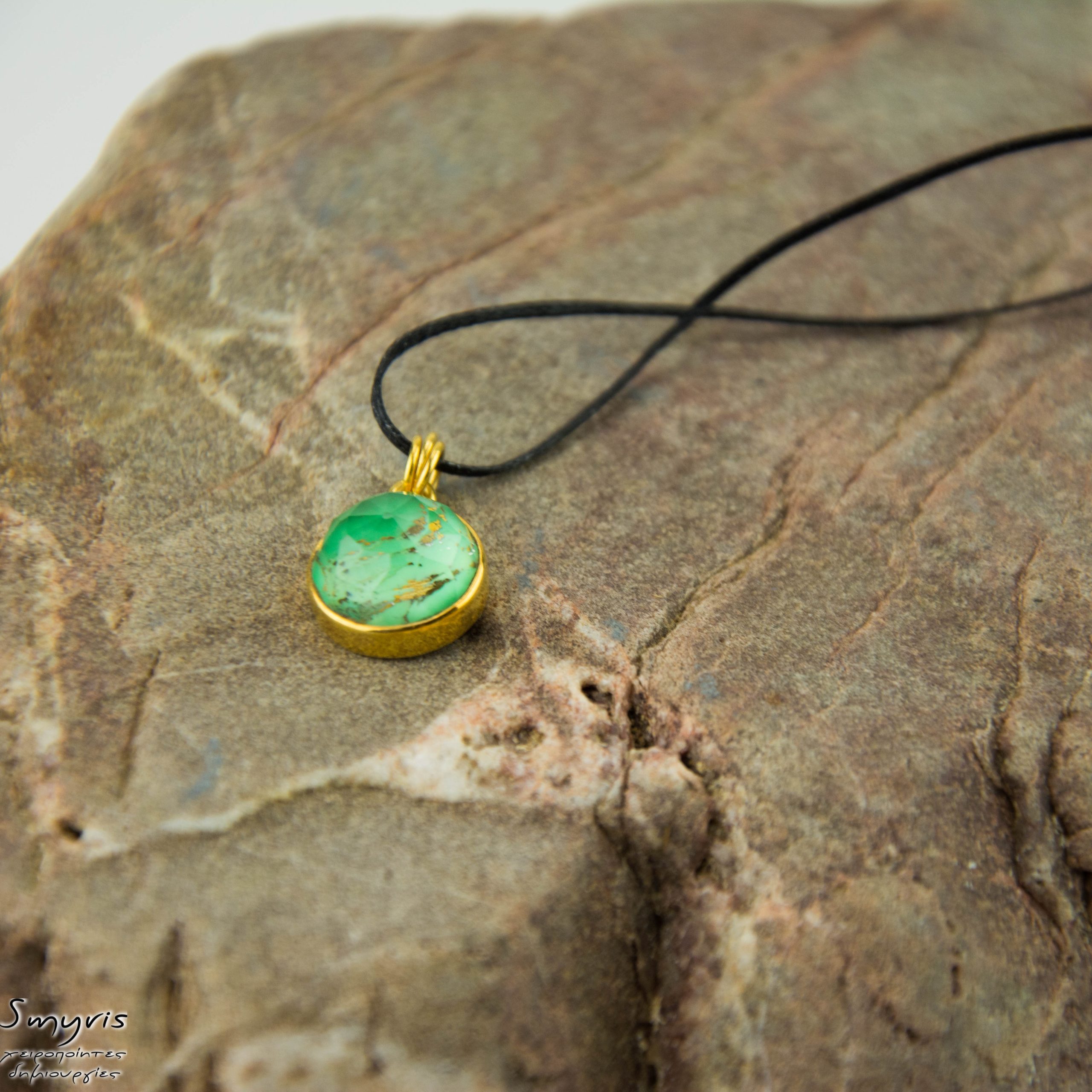 Μενταγιόν με πράσινο τυρκουάζ σε ασημένιο επιχρυσωμένο καστόνι, περασμένο σε κορδόνι. Μήκος 40εκ.