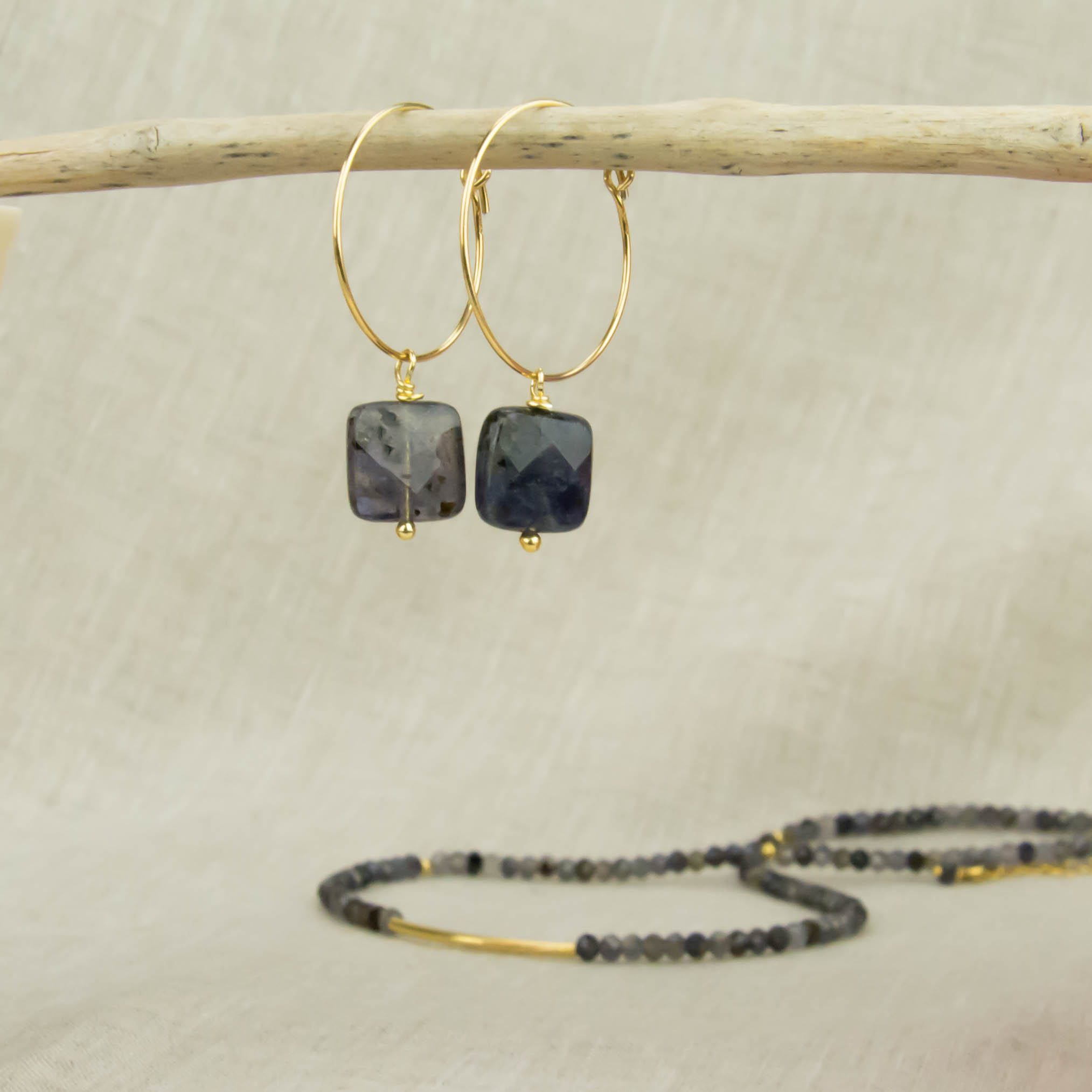 Σκουλαρίκια κρίκοι με κρύσταλλο Ιολίτη. Πολύ ελαφριά και όμορφα σκουλαρίκια για τη βόλτα και τη δουλειά σου!