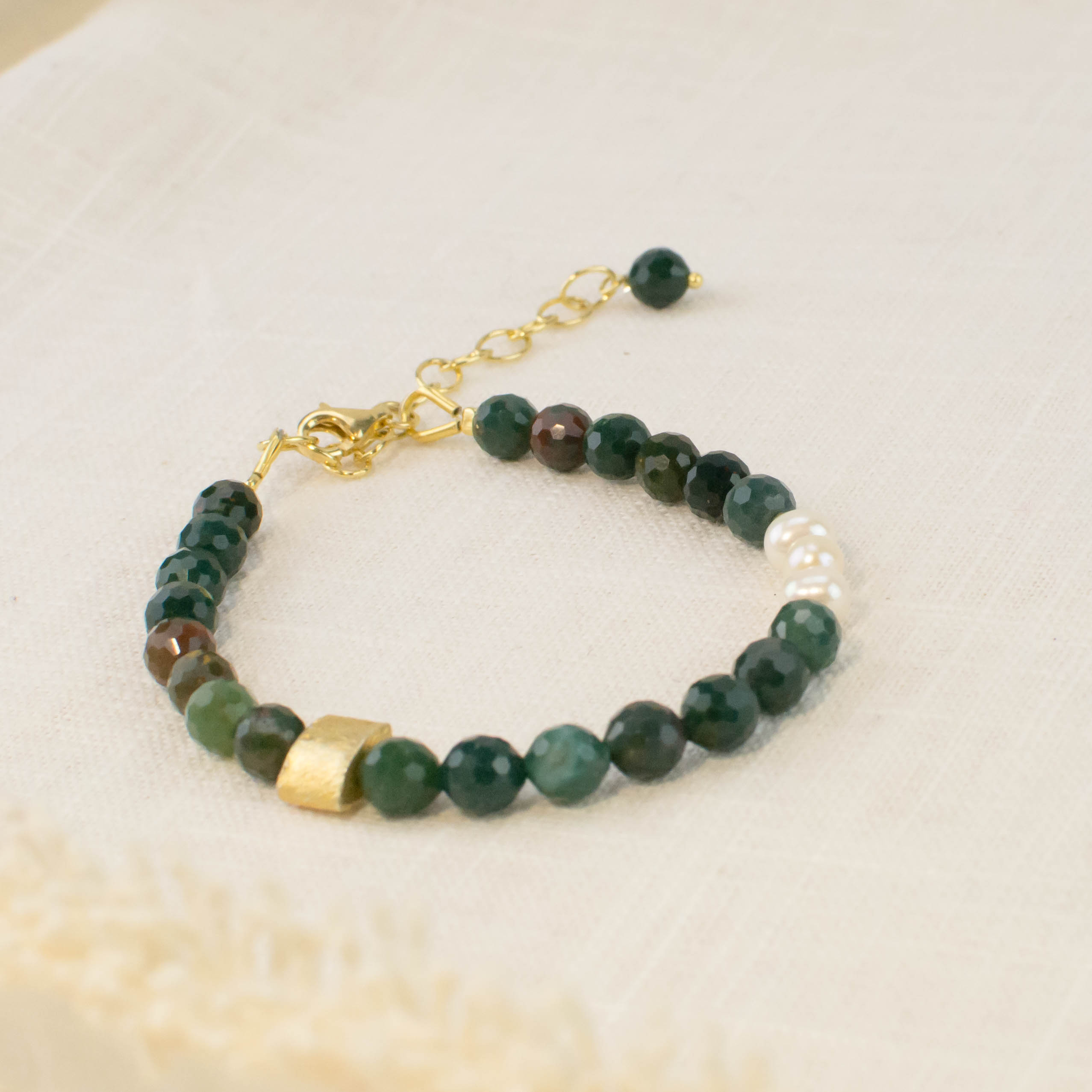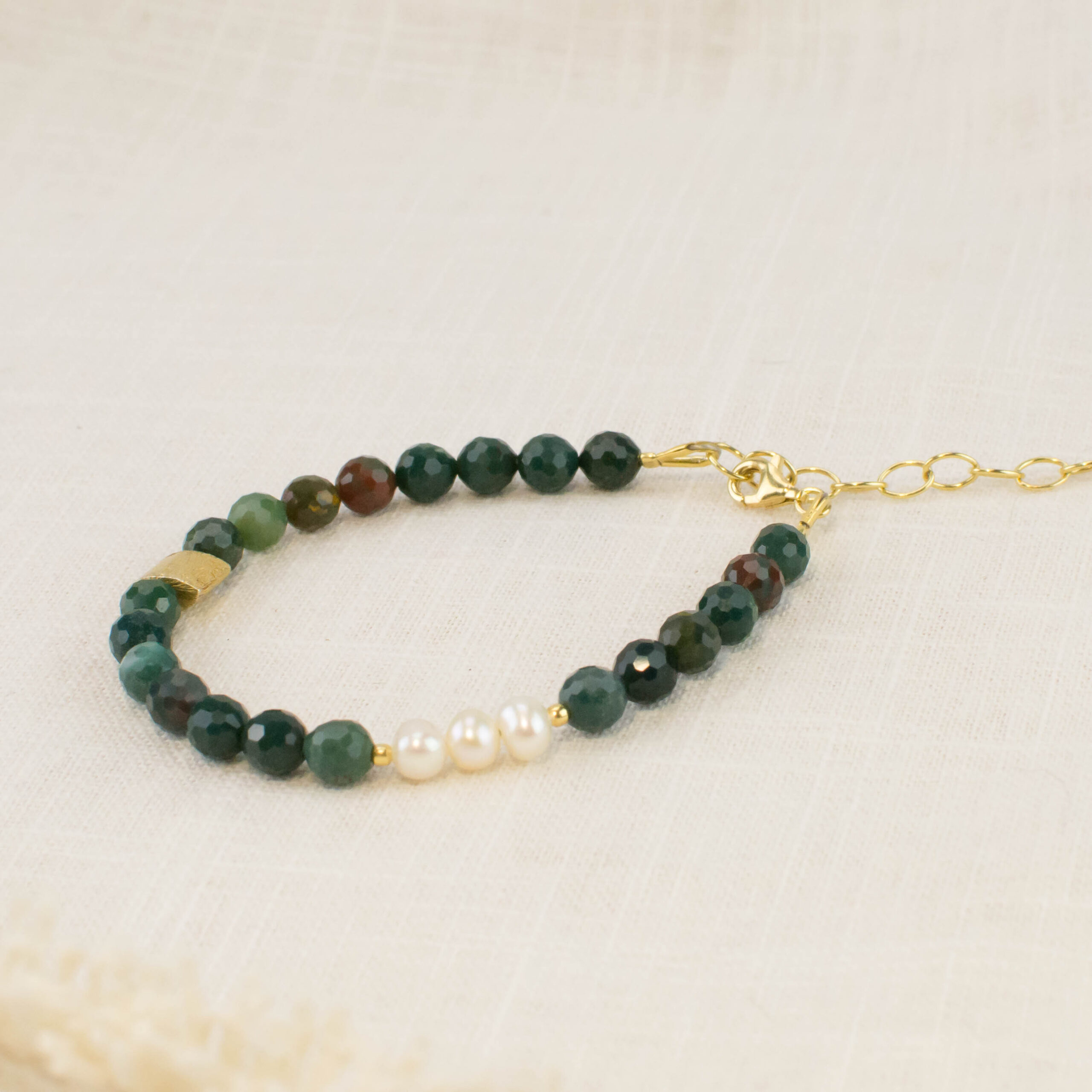 ▪️ Βραχιόλι με αιματόπετρα (bloodstone) και μαργαριτάρια, με ασημένια 925 επιχρυσωμένα στοιχεία και εξαρτήματα.
