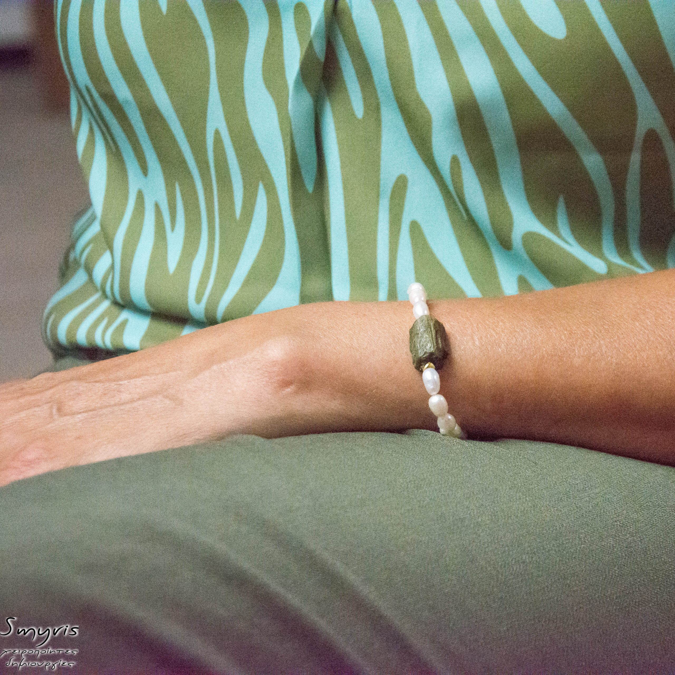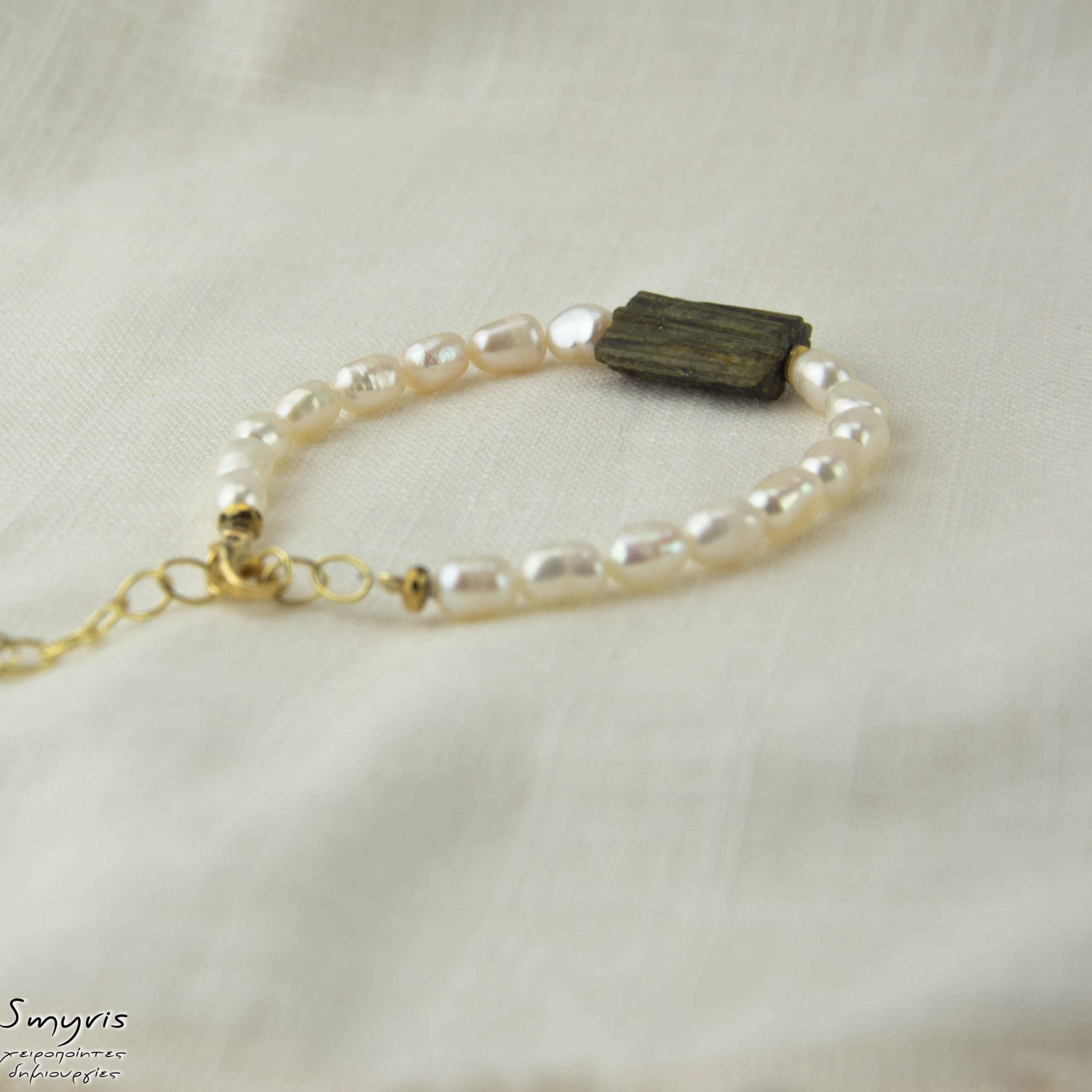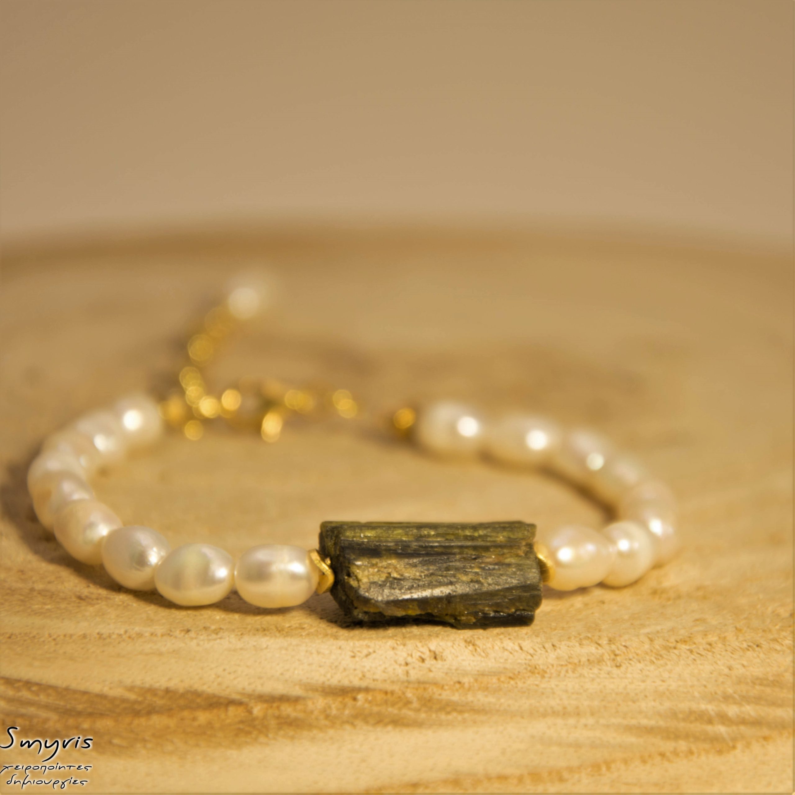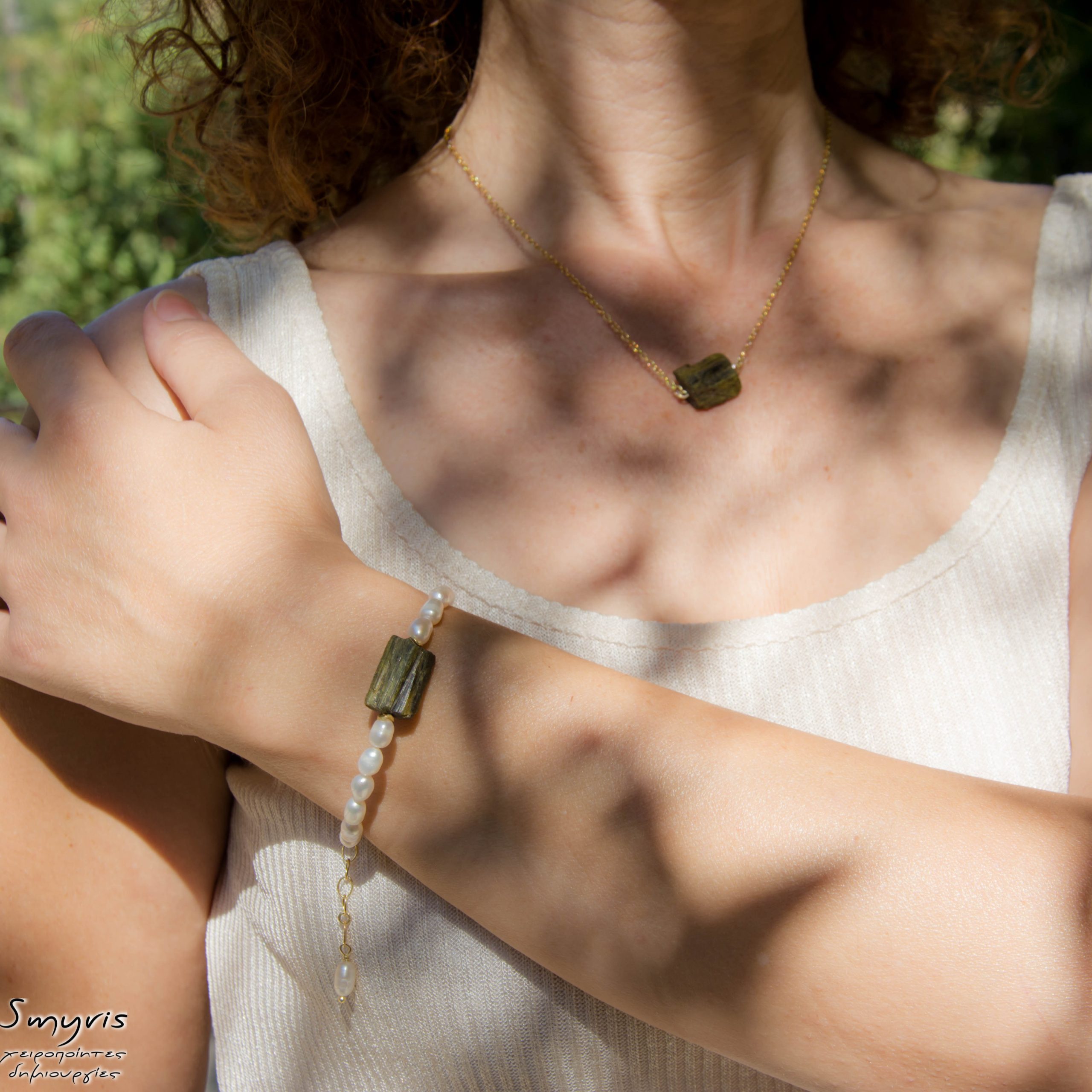 Βραχιόλι με πράσινη ακατέργαστη τουρμαλίνη, μαργαριτάρια και ασημένια 925 επιχρυσωμένα εξαρτήματα. Μήκος βραχιολιού 18εκ. συν 5εκ αλυσίδα επέκτασης. Μήκος κολιέ 45εκ. συν 5εκ αλυσίδα επέκτασης.